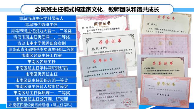 这种变革性力量在数据中得到验证。强校提质以来,学校有1名教师被评为山东省优秀教师、1名教师被评为青岛市优秀班主任,两名教师被评为市南区名班主任,一名教师获得青岛市班主任学科优质课一等奖,3名教师在市南区班主任优质课比赛获奖。在市南区第二届班主任节表彰中,五个表彰项目均获奖。学校全员班主任模式探索经验正在青岛教育圈引发涟漪效应,成为区域育人工作新范式。